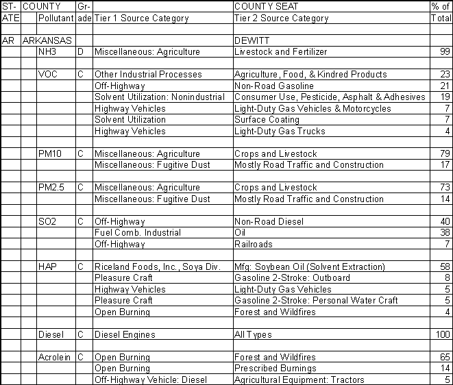 Arkansas County, Arkansas, give the percentage contributions from specific air pollution sources. The Arkansas County Seat is DeWitt, Arkansas. |