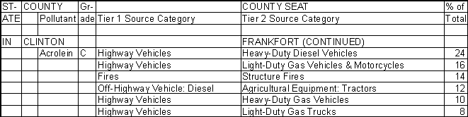 Clinton County, Indiana, give the percentage contributions from specific air pollution sources. The Clinton County Seat is Frankfort, Indiana. |