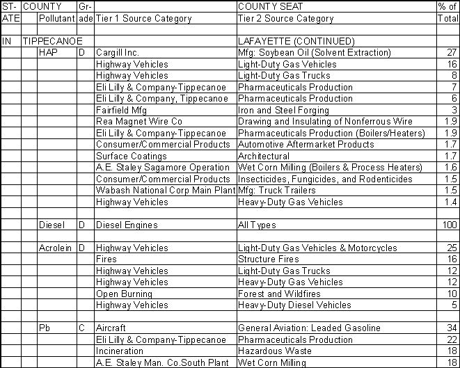 Tippecanoe County, Indiana, give the percentage contributions from specific air pollution sources. The Tippecanoe County Seat is Lafayette, Indiana. |