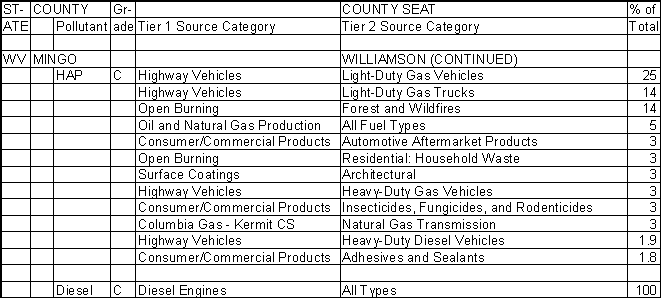 Mingo County, West Virginia, give the percentage contributions from specific air pollution sources. The Mingo County Seat is Williamson, West Virginia. |