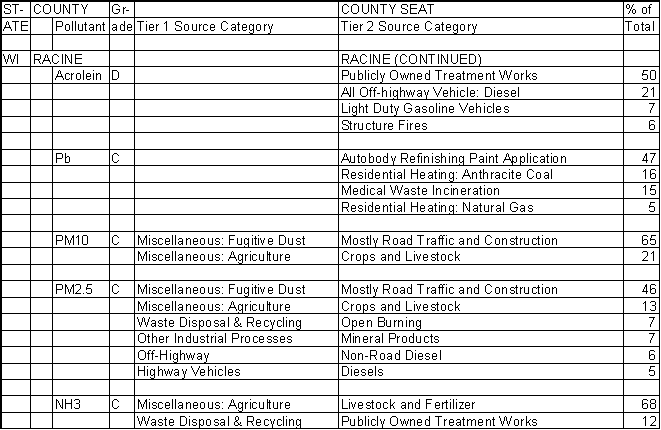 Racine County, Wisconsin, give the percentage contributions from specific air pollution sources. The Racine County Seat is Racine, Wisconsin. |